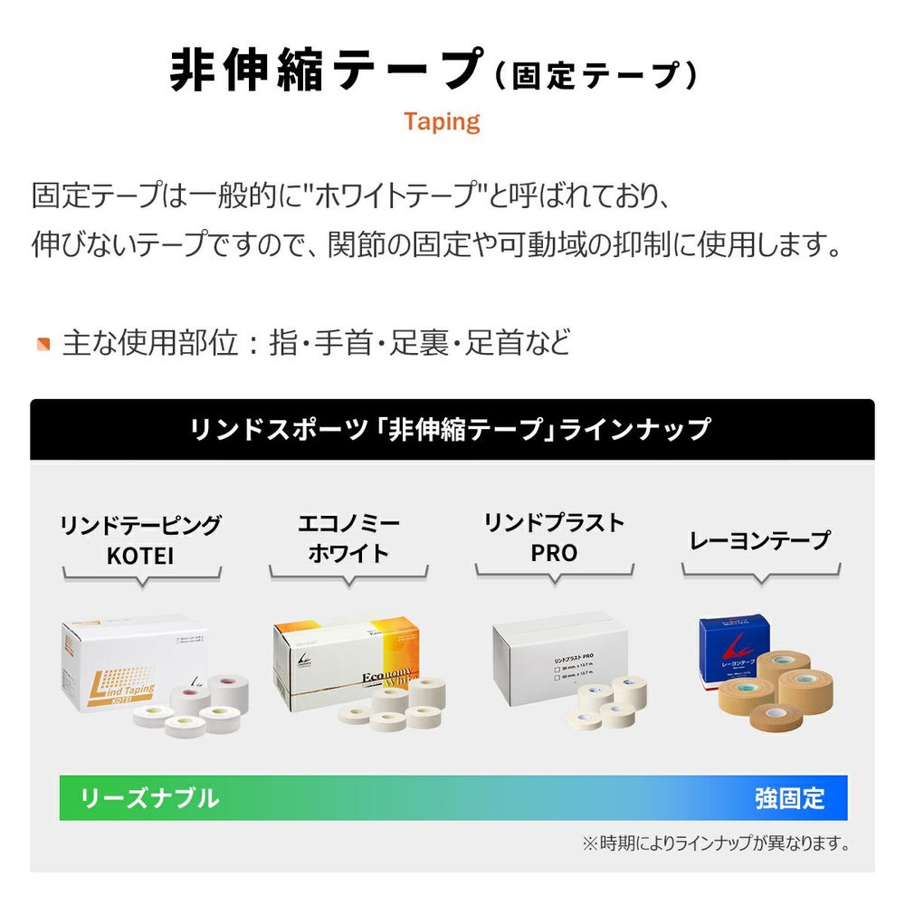 リンドテーピング「KOTEI」はリンドスポーツのオリジナル非伸縮テープの中で特にコストパフォーマンスに優れています。