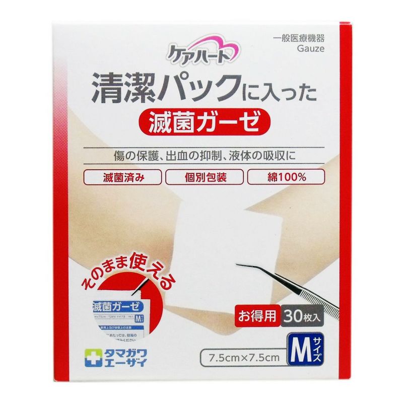 肌に優しい綿100%!!メディカルバッグに! ケアハート 清潔パックに入った滅菌ガーゼ Mサイズ お得用 30枚入