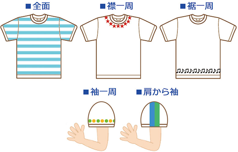 - 以下のようなデザインには対応できません。(縫い目にかかるプリント・前から後ろにかかるプリント・プリント範囲外の極端に大きなプリントはできません)